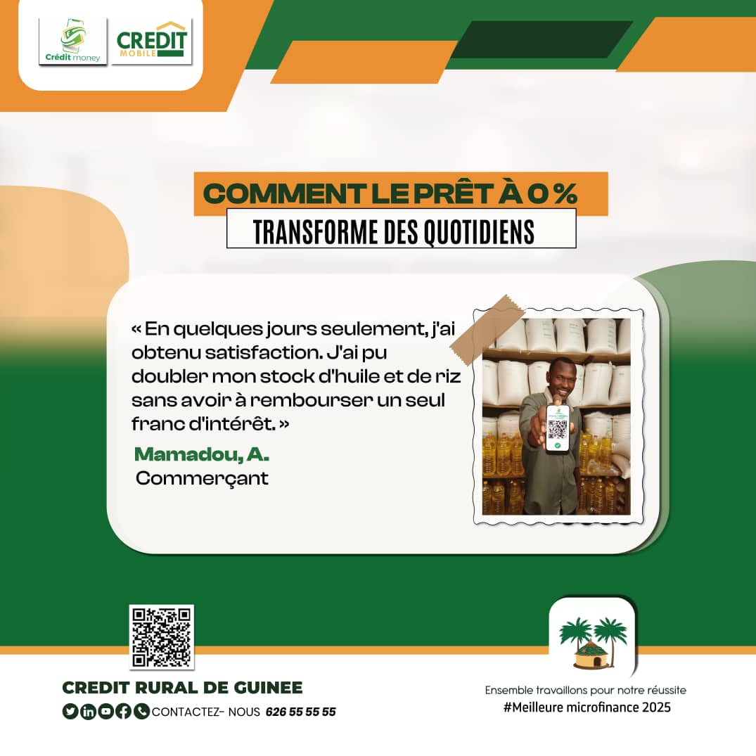 À Madina, le cœur battant du commerce de Conakry, l’offre exceptionnelle lancée au début de l’année 2026 par le Crédit Rural de Guinée porte déjà ses fruits. Rencontre avec Mamadou, un entrepreneur qui a su saisir l’opportunité pour changer d’échelle. Dans les allées bondées de Madina, la boutique de Mamadou ne désemplit pas. Pourtant, il y a encore quelques semaines, ce boutiquier dynamique faisait face à un défi de taille qu’est la rupture de stock. Malgré une clientèle fidèle, le manque de capital l’empêchait de répondre à la demande croissante. Comme de nombreux entrepreneurs, Mamadou redoutait les charges liées aux crédits classiques. « Vers la fin de l’année dernière, j’hésitais encore à m’engager pour un nouveau prêt », confie-t-il. Le tournant a eu lieu dès les premiers jours de l’année 2026, lors du lancement de notre offre spéciale. Attiré par la promesse d’un accompagnement sans frais supplémentaires, Mamadou a sollicité le nouveau prêt à 0 % d’intérêt du Crédit Rural de Guinée. La réponse ne s’est pas fait attendre. « En quelques jours seulement, j’ai obtenu satisfaction. J’ai pu doubler mon stock d’huile et de riz sans avoir à rembourser un seul franc d’intérêt. C’est un soutien direct et concret à mon activité », se réjouit-il. Au-delà du financement, c’est toute l’organisation de son commerce qui a évolué. Mamadou a adopté Crédit Money, la solution de paiement digital du CRG. Un choix qui simplifie la gestion de sa caisse au quotidien. « Mes clients me paient désormais directement sur mon téléphone. C’est propre, c’est rapide, et cela sécurise mes recettes. Il ne fait aucun doute que mon commerce va grandir de jour en jour », affirme l’entrepreneur avec optimisme. L’histoire de Mamadou n’est pas isolée. Partout en Guinée, des centaines de commerçants profitent de cette injection de capital gratuite pour moderniser leurs installations ou renforcer leurs stocks. Cependant, le temps presse. Lancée pour dynamiser le début de l’année 2026, cette offre historique prendra fin le 28 février prochain. Comme Mamadou, les commerçants désireux de booster leur activité sans frais sont invités à se rapprocher d’une agence Crédit Rural de Guinée dès aujourd’hui.